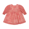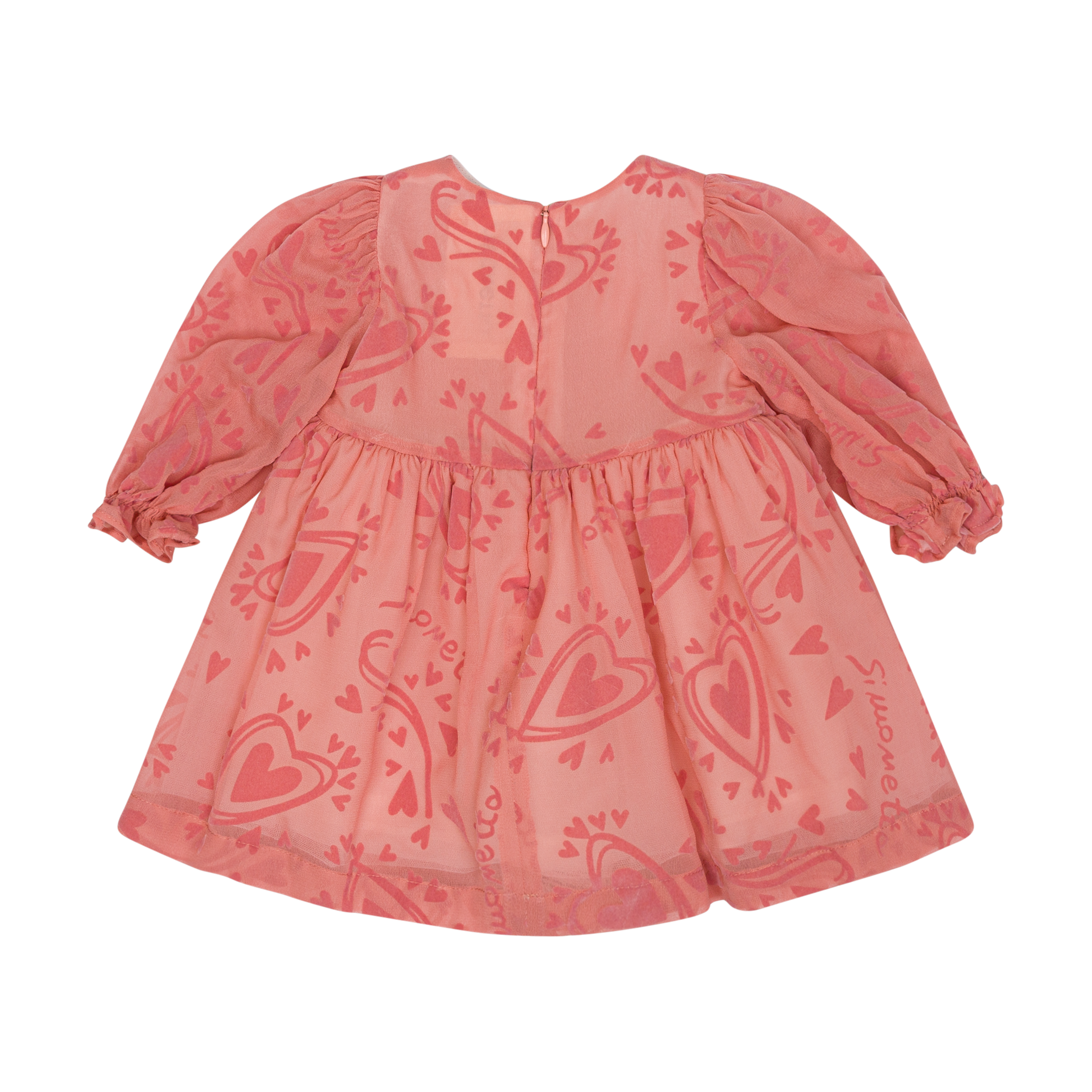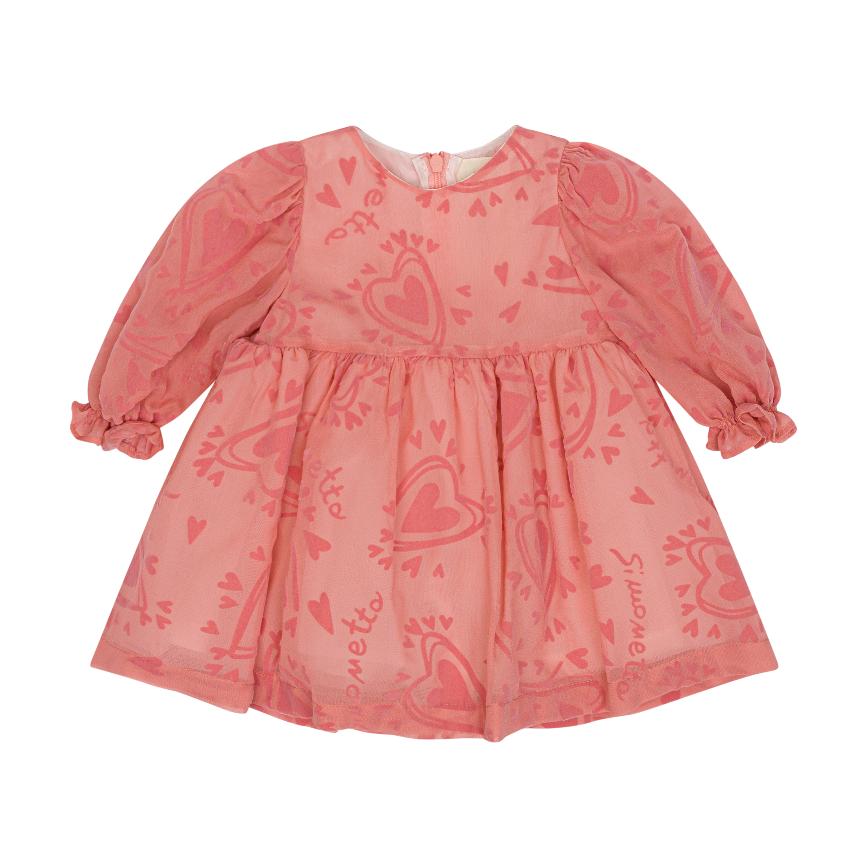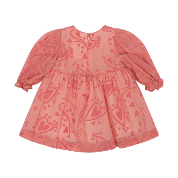 Abito Simonetta per bambina a girocollo con maniche lunghe a sbuffo nel colore pesca. E’ caratterizzato da cuori e logo tono su tono e chiusura zip nascosta nella parte anteriore.