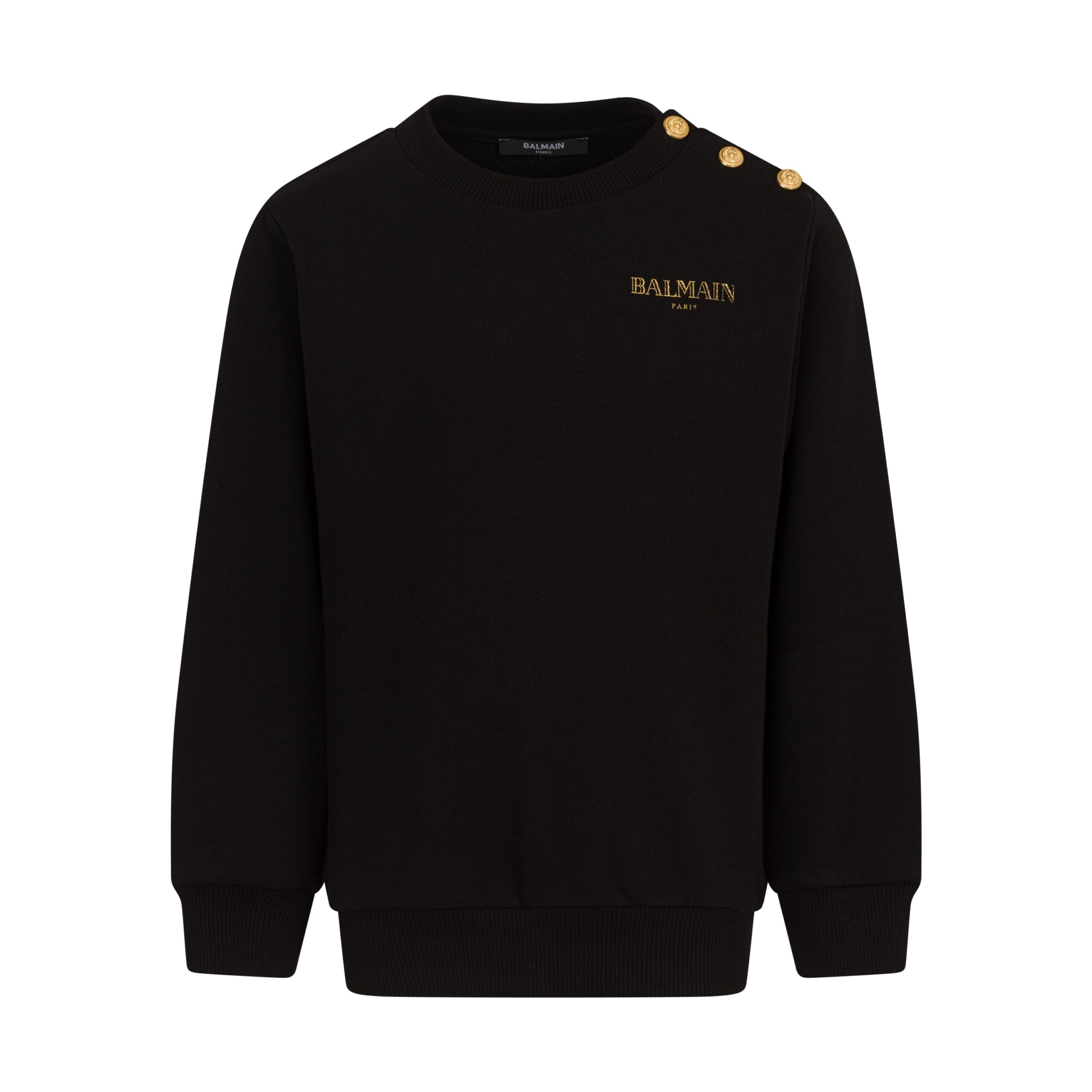Felpa Balmain per bambino a girocollo, maniche lunghe nel colore nero con logo sul petto e dettaglio bottoni iconici oro sulla spalla.