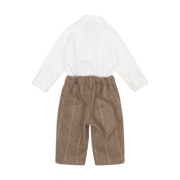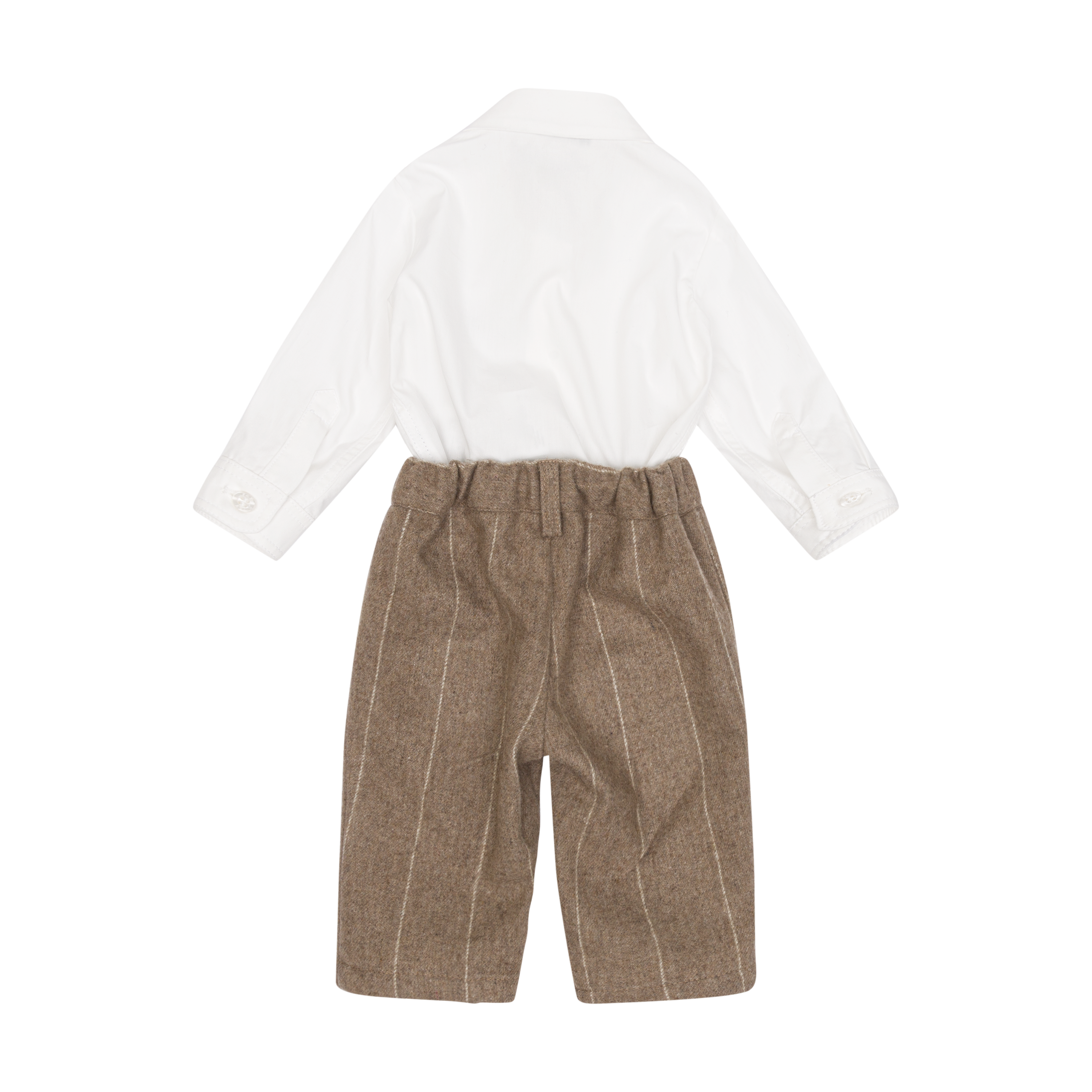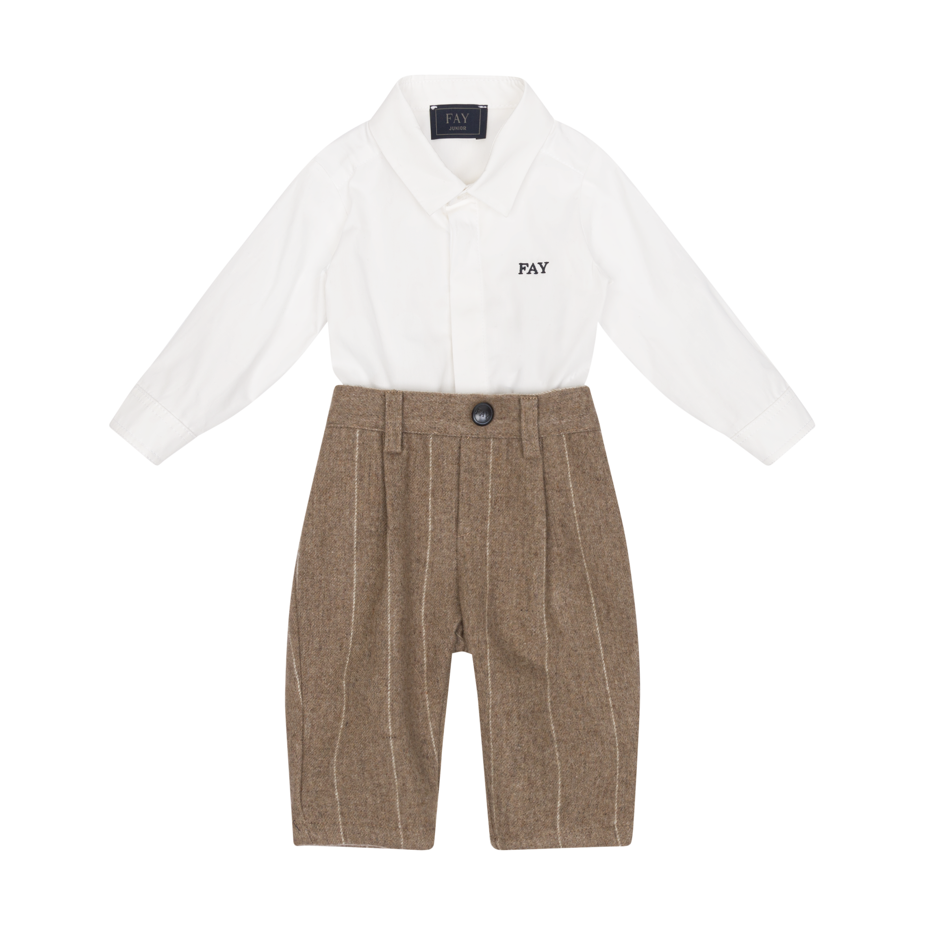 Completo neonato Fay composta da pantalone gessato marrone con chiusura a bottoni e camicia a maniche lunghe bianca con logo ricamato.