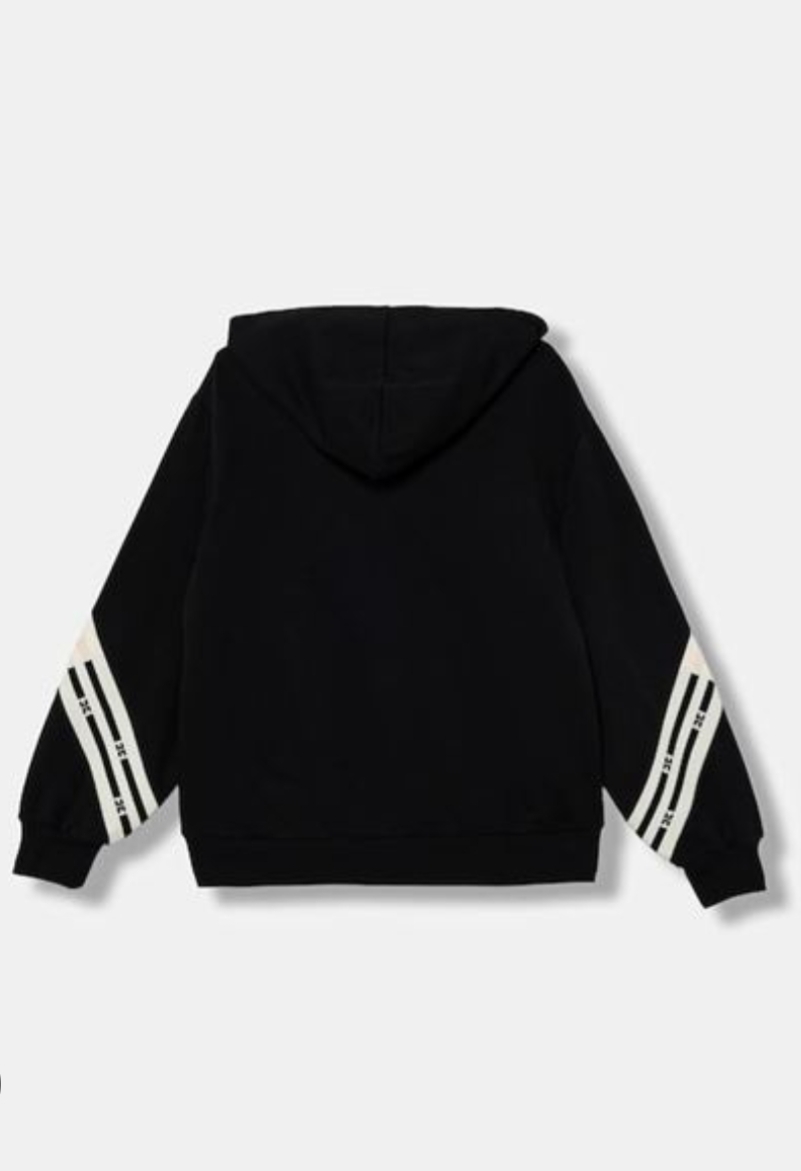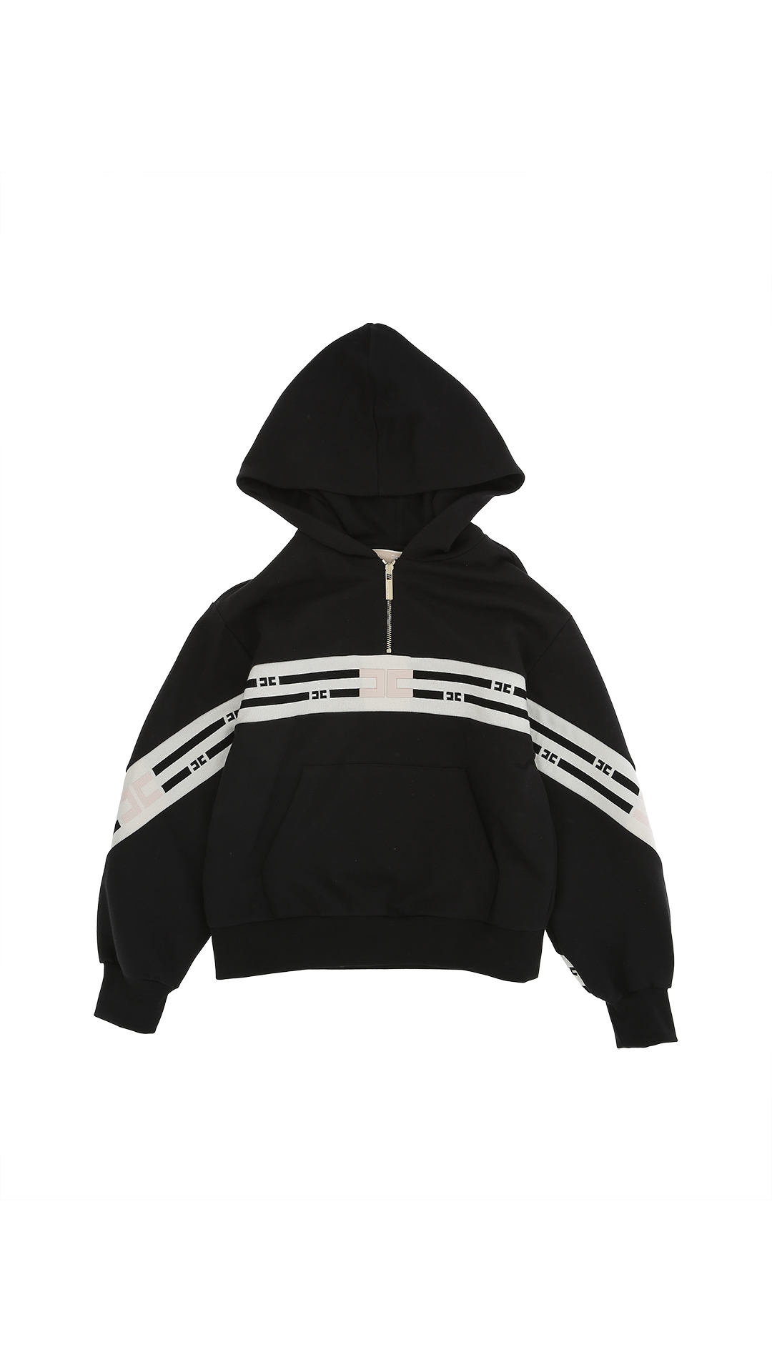 Felpa Elisabetta Franchi nero, latte e rosa per bambina con cappuccio, polsini e orlo rifiniti con un cordino elastico. E’ caratterizzata da una piccola chiusura zip, modello largo e ampia tasca sulla parte frontale .